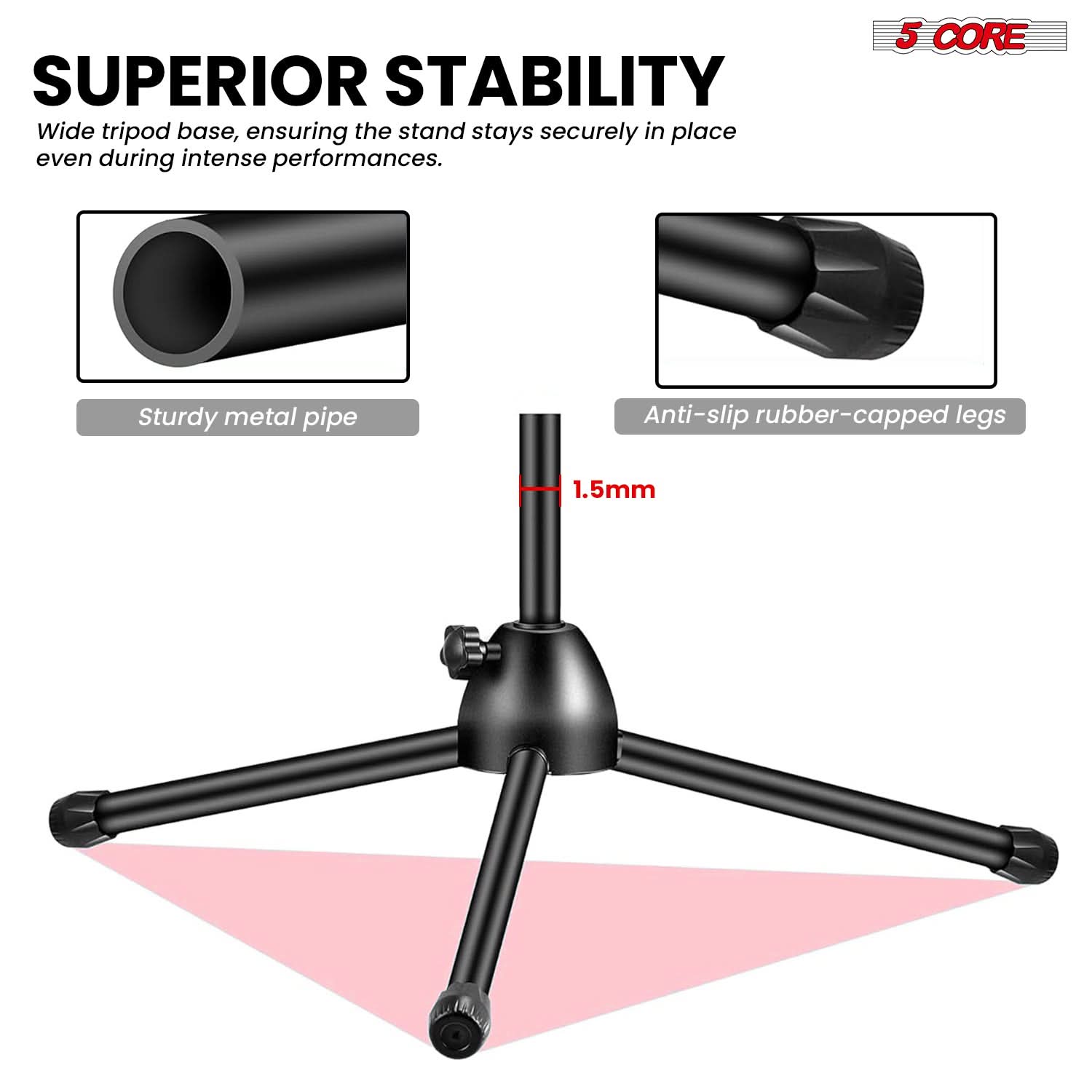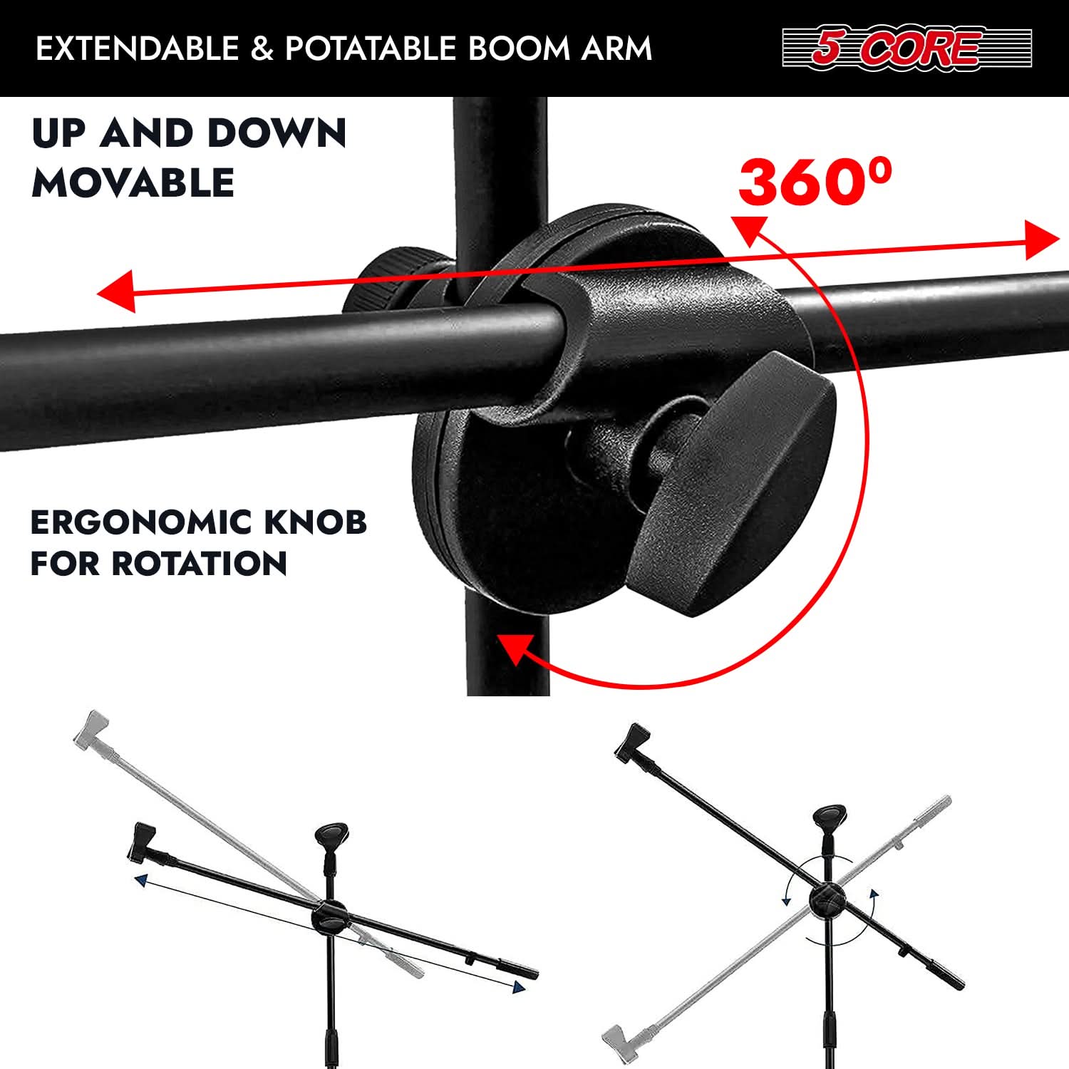The 5 Core mic stand has adjustable height. The minimum height is 31 inches, and the maximum height is 76 inches. The 30 inch boom arm rotates 360 degrees for easy positioning, it can be lowered to 2 inches. The tripod leg design features sturdy metal legs with rubber caps, making it stable even on uneven surfaces. The heavy duty mike stand has a strong metal build quality and reinforced clutch, holding up to 3.5 lbs. This floor mic stand comes with 2 mic holders and 3/8" to 5/8" screw adapters, fitting most mics and accessories. Portable soporte de micrófono, collapsible design, and can be assembled in minutes. Perfect for anyone who needs a reliable, versatile mic stand. |
